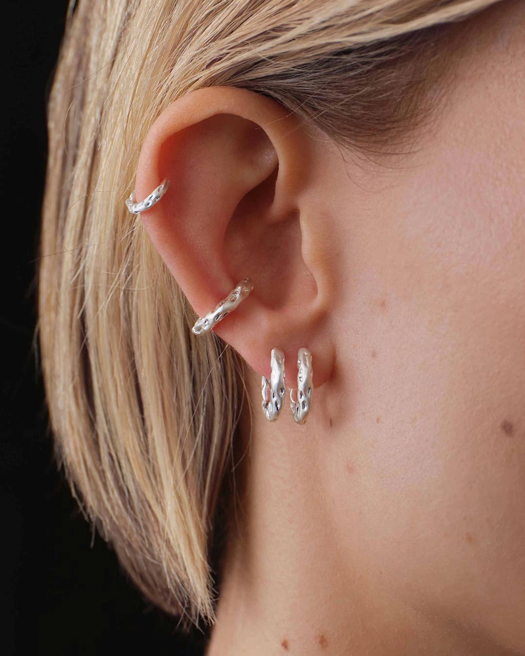 Sole Huggie Hoops, laget av 100 % resirkulert messing, har en hamret overflate som skaper et særegent utseende. Øredobbene selges parvis og kommer i størrelsene 6 og 9 mm. Perfekte å bruke alene eller stables sammen for et mer personlig uttrykk.