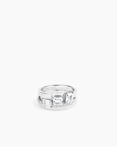 A ring with an open design and a sparkling cubic zirconia stone, crafted in 925 sterling silver and also available with 14k gold plating. Can be paired with the Sopra Emerald and Vertical Aperto Emerald rings for a unique ring stack.